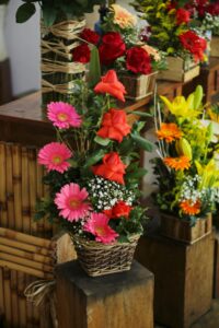Arranjos delicados com flores selecionadas, harmonizando com a decoração e criando um ambiente acolhedor.